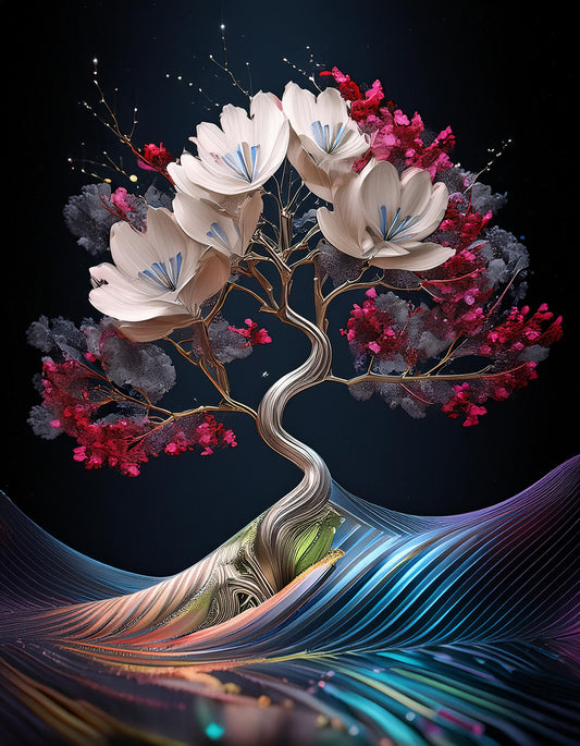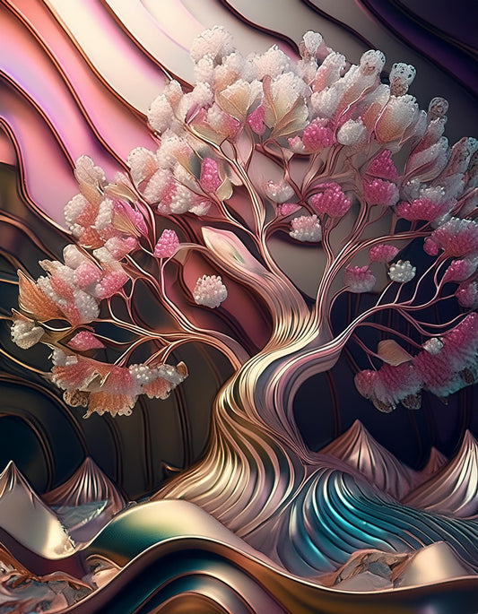 3D Cherry Blossom Tree Futuristic Chromatic Waves Colorful | Scenic Wallpaper