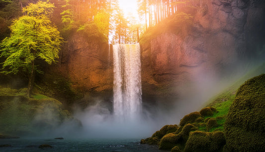 Sun-Kissed Waterfall in Mist Wall Mural | Interior Design Inspiration Wallpaper