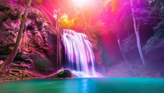 Colorful Waterfall On A Forest With Mist And Sun Rays Wall Mural | Interior Decor Wallpaper